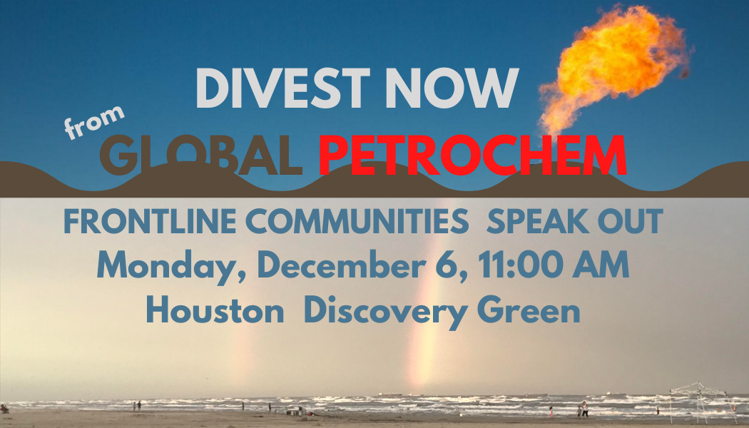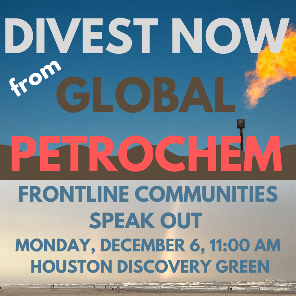 Fossil fuel pollution and climate disasters are already disrupting millions of lives worldwide. From fires, to floods, to hurricanes like Harvey and Ida, to the brutal winter storm we experienced last February in Texas, we are living in the midst of a climate emergency. We deserve a world beyond fossil fuels: a world where we can breathe clean air and drink clean water, where workers’ rights, community health, and our shared climate come before corporate profits. That’s why we are uniting to ensure all sectors — government, finance, and the Global Petrochemical Congress divest from extractive industry and invest in restorative and sustainable community-based solutions.